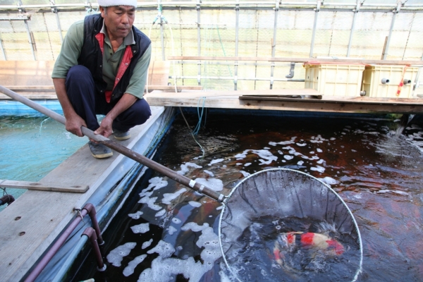 Teradomari Koi Farm. Diese Koifarm wird von Herrn Hoshino betrieben, er züchtet Ginrin Gosanke seit über 18 Jahren. Die Teradomari Koifarm ist in japan berühmt für Ihre Dia-Gin Rin Varietäten, insbesondere Kohaku. Hoshino San züchtet seine Ginrin Kohaku aus Elterntieren die aus der Tomoin (Hoshikin) und Sensuke (Matsue) Blutlinie stammen, dies beschehrt ihm sehr gutes Wachstum, seine Kohaku werden nicht selten über 80cm !
